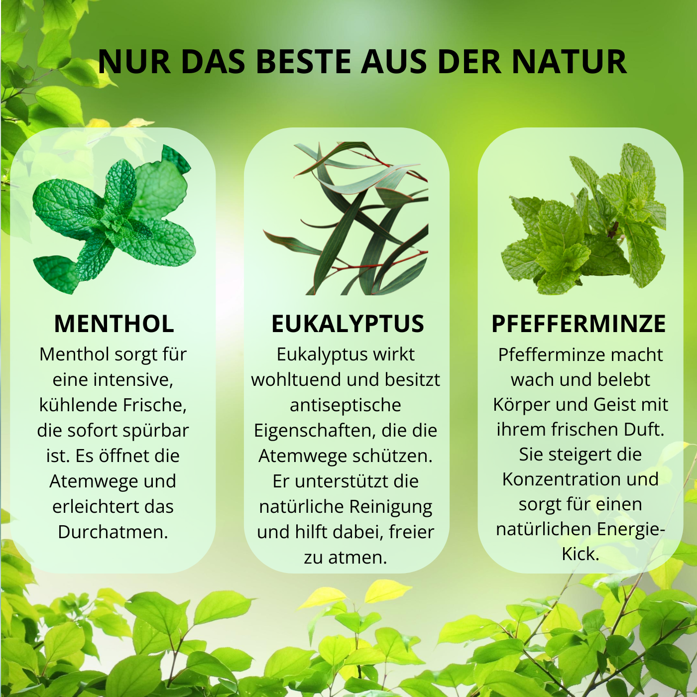 Menthol, Eukalyptus, Pfefferminze, Borneol und Kampfer – 100 % natürlich für freie Atemwege und frische Energie.